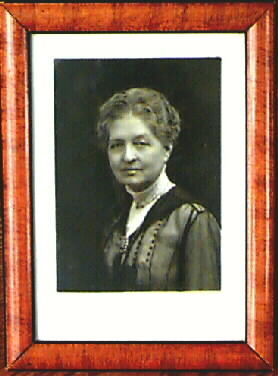 Fotografi, inglasat i en brun träram. Bilden föreställer Sofia Lange som bär en höghalsad blus med en tunnare dito över.