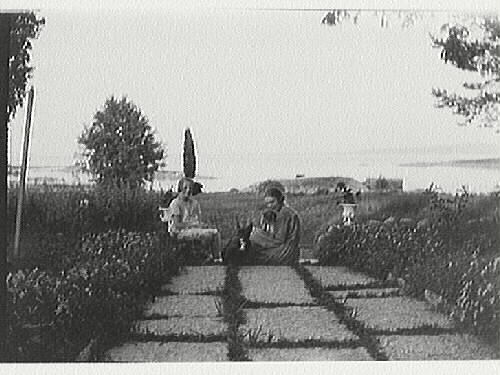 Porträtt på Maj-Britt Ander och Rigmor Ander, döttrar till Ester och G S Ander. Bilden är tagen vid sommarvillan, Sjövik. Hunden Stazy sitter vid Maj-Britt och hon har en katt i knät.