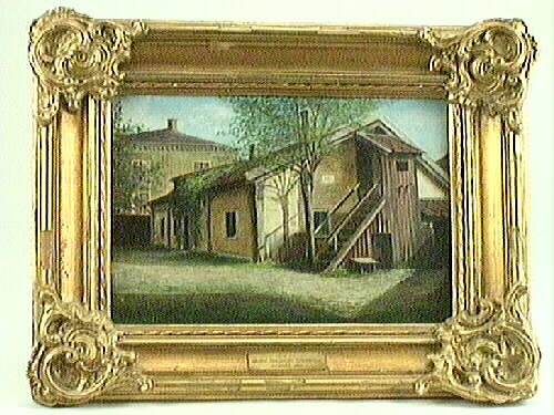 - Oljemålning förställande exteriören av gården "Texas" som låg i kvarteret Neptunus i Nya Staden, Lidköping. Målningen är signerad "C J Nilsson 1916", i nedre högra hörnet. Ramen är förgylld med ornamentik i hörnen. Nederst sitter en metallbricka med ingraverad text: GÅVA AV GEORG DALQVIST STERBHUS ALINGSÅS 1964. Snöre som upphängnings- anordning på baksidan.