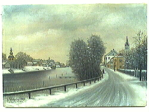 Oljemålning kopierad av Benjamin Lidholm 1946. Skänkt till bagare Georg Westerståhl på hans 60-årsdag , 5 april 1946. Bilden visar ett vintrigt Lidköping 1889, avmålat från Hamngatan med utsikt över Lidan och Nya Staden.