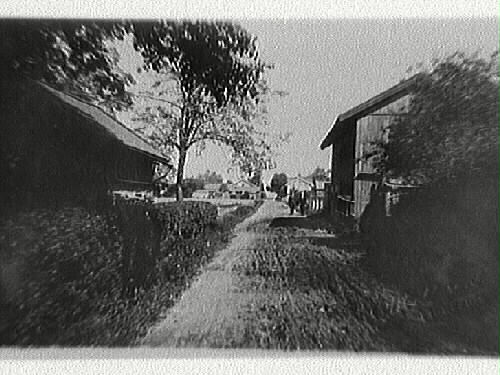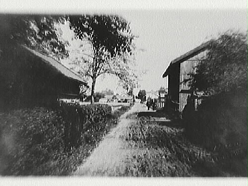 Lidköping, Kvarngatan med omgivande bebyggelse. Uthuset till vänster tillhörde fröknarna Smedman. Byggnaden ligger i nuvarande kvarteret Giraffen. Till höger Norddalens ladugård, ägare Oskar Björklund. Byggnaden ligger i nuvarande kvarteret Grävlingen. Längst ner till höger skomakare Gillgrens fastighet, det låga huset till vänster om gatan var Gillgrens skomakarverkstad. Här fanns även hyresrum. Där bakom syns gaveln på fastigheten Kvarngatan 4.