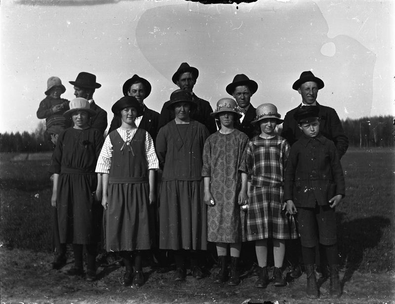 1 Lisa Andersson, 2 Anna Widja, 3 Gunhold Widja, 4 Ester Widja, 5 Ragnhild Widja, 6 Widja (förnamn okänt), 7 okänd, 8 August Larsson, 9 Erik Nilsson, 10 Axel Stark, 11 Widja (förnamn okänt), 12 Algot Larsson. Fotot är taget utomhus.