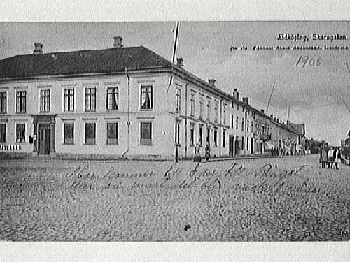 - Skaragatan mot SydÖst. Kvarteret Guldsmeden närmast i bild. Tre bilder med samma motiv: Glasplåtskopia (Fo 1992/0221:01), vykort (1984:0126:02) och originalkopia/vykortsförlag (1988:0334). Vykortets utgivare är Albin Anderssons förlag i Lidköping.