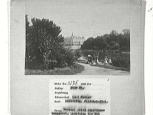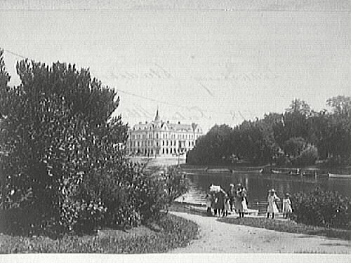 Badhusparken med Statshotellet och floden Lidan i bakgrunden. Originalkopia. Vykortsförlaga.