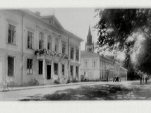 Hamngatan och Nya Rådhuset (Lidbeckska huset) i Lidköping samt kvarteren Domherren och Gladan. I bakgrunden synes S:t Nicolai kyrkan. Avfoto av vykort med förlaget Albin Andersson.