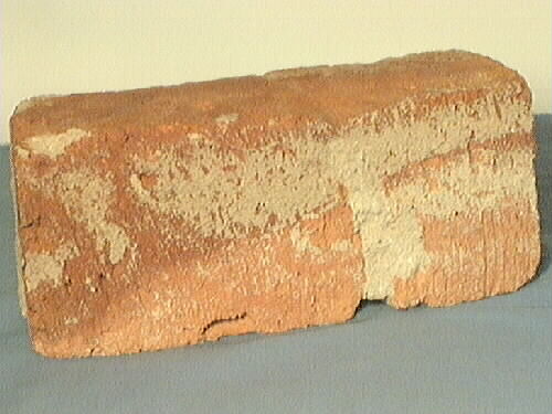 Tegelsten. Röd, stämplat Hålltorp på ena kortsidan. Har andvänts som mursten; spår av murbruk.