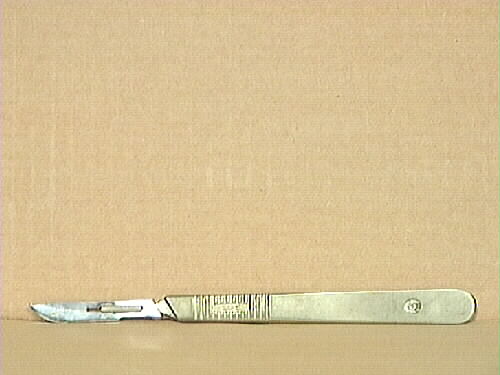 Skalpell med skaft och blad. På skaftet finns ett utformat grepp. På en sida av bladet finns texten: ENGLAND och siffran 10 inristade. En sida på skaftet finns texten: DAHLE och siffran 3. På den andra sidan finns texten: MADE IN ENGLAND och koden: BS2982. Bladet är stålfärgad och skaftet är guldfärgad.
