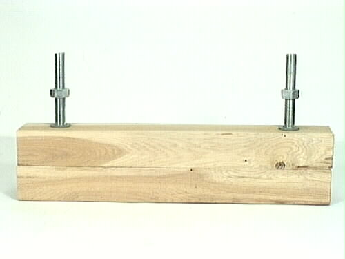 Bokbindarpress, varvid den består av två rektangulära, träklossar. Två hål, i varje kloss, finns borrade. Två, gängade, cylinderformade stålstänger, finns istoppade i vardera hål. Varje stång har en stålbricka och en mutter.