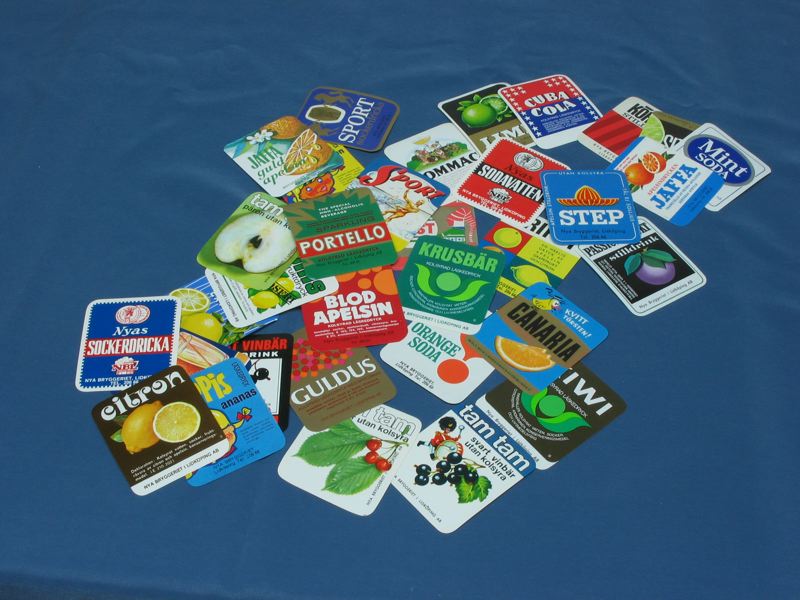 Flasketiketter från Nya Bryggeriet i Lidköping. 34 etiketterstående format:KIWI, CANARIA, APRIKOS, TRIPCI, SPORT, Guld JUL MUST,KRUSBÄR, PORTELLO, JAFFA guld-apelsin, SPORT sockerdricka, MINT SODA, smal sockerfri LIME,KÖRSBÄR STILLDRINK, CUBA COLA, LIME, CITRON EXTRA, citron, APELSIN saft, Collis citron fruktdryck, BLOD APELSIN, STEP, PiPPis ananas, GULDUS, ORANGE SODA, PiPPis hallon, POMMAC, SVART VINBÄR STILLDRINK, APELSINDRYCKEN JAFFA, PASSIONSFRUKT STILLDRINK, Nyas SOCKERDRICKA,Nyas SODAVATTEN, tam tam körsbär utan kolsyra, tam tam svarta vinbär utan kolsyra, tam tam päron utan kolsyra.