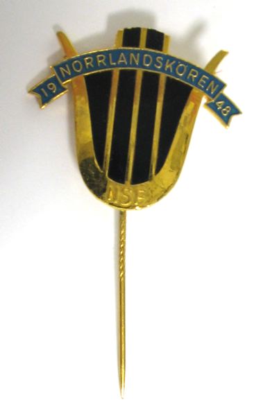 Märkesnål i gulmetall och blått från Sångarfesten i Norrland 1948. Lyrformigt märke med språkband över lyran med texten "19 - NORRLANDSKÖREN - 48". Nederst på lyran NSF (Norrlands Sångarförbund). På baksidan fastlödd nål och tillverkarnamnet instämplat "CC Sporrong & Co Stockholm".