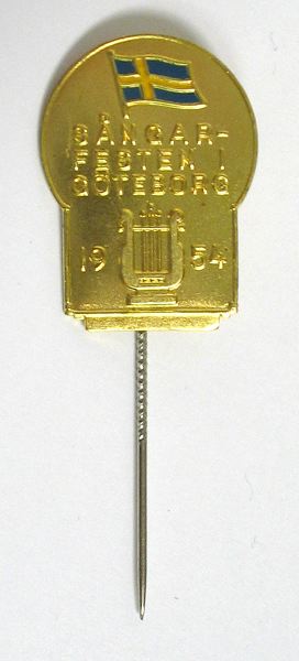 - Märkesnål i gulmetall och från Sångarfesten i Göteborg 1954. Nyckelhålsformigt märke med Svensk flagga i gult och blått överst och lyra underst samt texten SÅNGAR-FESTEN I GÖTEBORG 1954 däremellan. På baksidan fastlödd nål och tillverkarnamnet instämplat "CC Sporrong & Co".