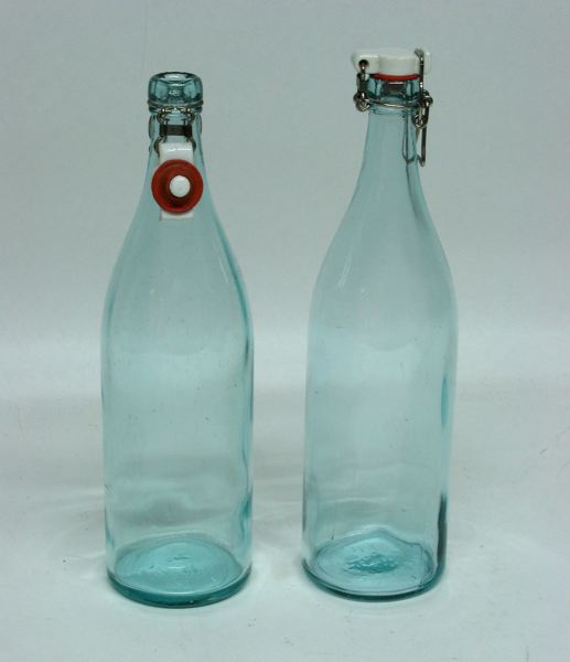 Två flaskor med patentkork. Märkt med tre stjärnor i botten runt ett Å. Flaskan är i grönt glas medan porslinskorken är vit. Flaskan kommer från Nya Bryggeriet i Lidköping.