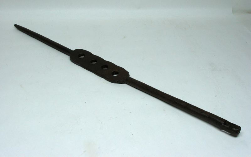 Gängdon smitt i ett stycke, med fyra gängade hål i en platta. Två handtag, det ena med spetsig avslutning och det andra med ett rektangulärt hål i änden.