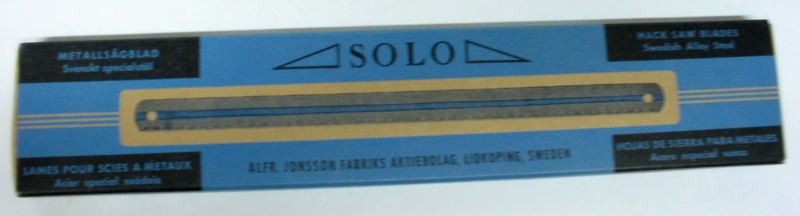 - Förpackning för metallsågblad av märket SOLO. Tillverkad för Alfred Jonssond Fabriks AB i Lidköping. Hylsa med innerlåda. Tryck i svart och blått. Ordet metallsågblad på svenska, franska, spanska och engelska ett i vardera hörnet på ovansidan samt ett sågblad mitt på. På lådans kortsida står HACK SAW BLADES , 12"X1/2", 18T.