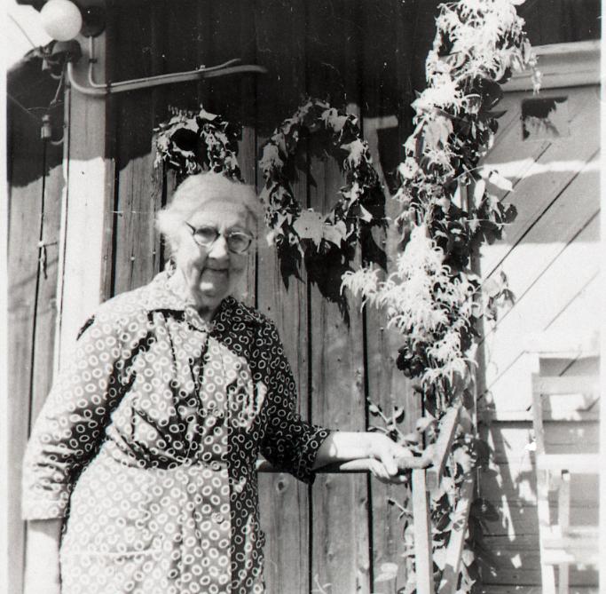Fotografi av Hedda Handfast utanför sin stuga i Stenhammar, Gösslunda.