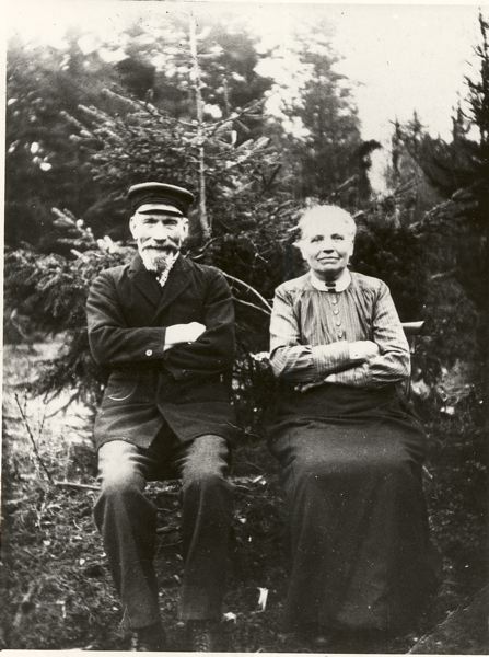 Porträtt av Skeppare Mattias Hjelm f. 1861 på Fähagen, Sunnersberg, d.1934 på samma plats. Hustrun Ida Charlotta f. Lake 1861 i Kålbotten, Kållandsö. D.1940 på Gösslunda ålderdomshem. Mattias var skeppare ombord på slupen "Jenny" av Råbäck som gick med kalklaster. Makarna fick 12 barn. På äldre dagar gick Mattias omkring och sålde jultidningar. Uppgiftslämnare Erik Hulander är barnbarn till paret Hjelm (morföräldrar).