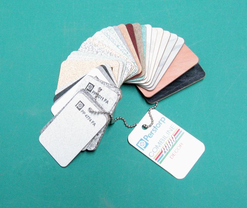 Prov på Perstorpsplatta. 32 stycken olika dekorer/färger/mönster fastsatta i en kedja med en skylt i samma storlek som proverna med texten: "Combiline 2000 Decor". På varje bit är tryckt ett artikelnummer. Perstorpsplattan användes till bordsskivor till köksbord, samt bord till personal- och skolmatsalar från 1950-talet till nu (2006). Vid beställning av bord kunde kunden beställa vilken typ av skiva detta skulle täckas av.