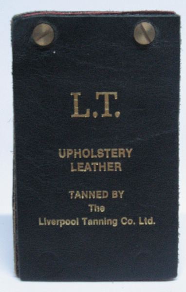 - Prov på skinn till enelska skinnmöbler från Liverpool Tanning Co. Ltd. På tramidans svarta skinn firmanamnet i guld. Sju provbitar i olka färger (rött, brunt, grönt, ljusbrunt, guld, koppar - färgernas namn står på engelska). proverna är fastsatta med två märringsskruvar på en svart pappbit. På baksidan en klisterlapp med skötselråd på engelska.