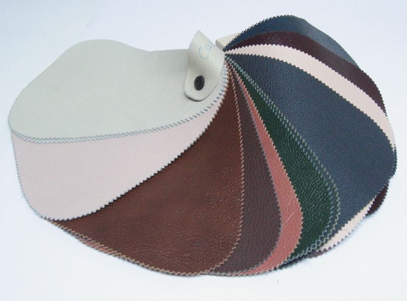 Prov på skinn till skinnmöbler - "Cartei" -skinn i 17olika färger. Proverna är skurna i en triangulär form med rundade hörn och kanten klippt i uddar. Proven är hopfästade med en plastskruv i ovankanten och där är fäst en remsa skinn som handtag. På remsan är skrivet Cartei med kulspetspenna. På baksidan av varje prov är fast en klisterlapp med tryckt text: Cartei S.a.s., Leather Cat. Standard, Art. OASI samt färgens namn eller nummer.