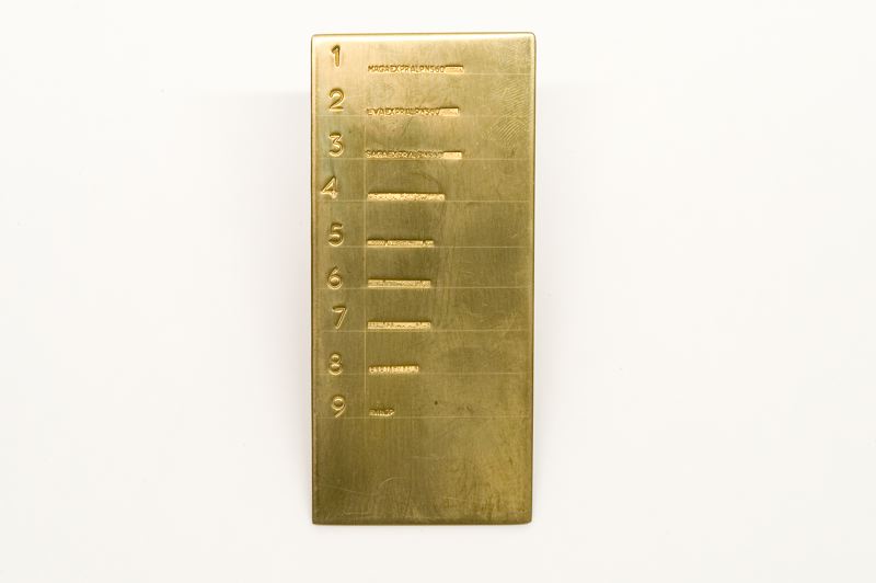 En mässingsplåt numrerad 1-9 med inslagna kontrollstämplar för nysilver och mässingsföremål. Till stämpellikaren hör en förteckning daterad 19/11 1979.