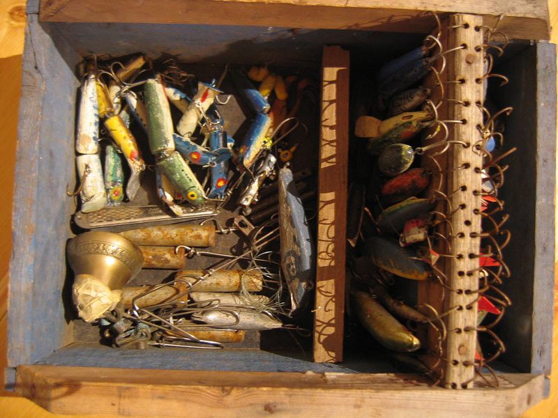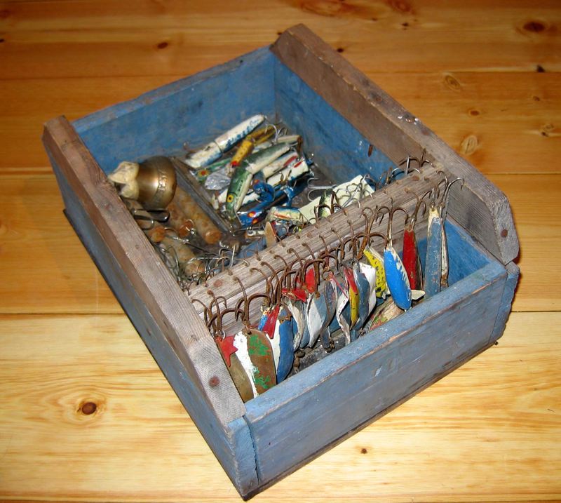 Draglåda påbyggd för att användas som förvaringslåda för utterdrag. Den ursprungliga lådan är blåmålad och de tillsatta omålade. Lådan är full med drag och annan utrustning: