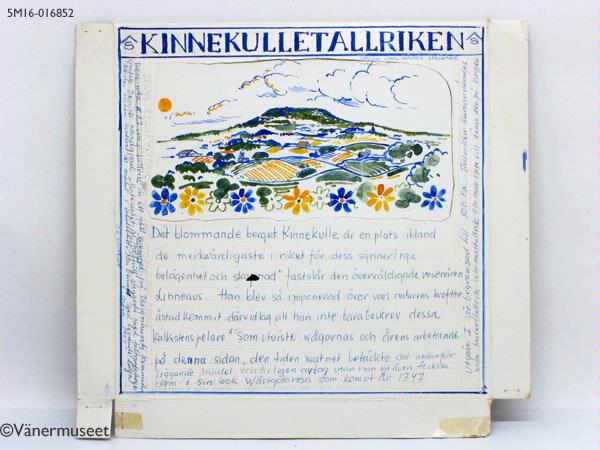 Förlaga till trycksak "KINNEKULLETALLRIKEN". Design Carl-Harry Stålhane, med en vy mot Kinnekulle samt text om det blommande berget under gjort på ett tårtkartonglock. På ena kanten står "Denna 27 cm tallrik är ett gott exempel på Designhusets keramiska grafik. Den är handgjord. Materialet är blyftitt stengods med fältspatglasyr under vilket motivet är målat i koboltblått som bränns med levande låga i nära 1400 gr." På andra sidan står: "Utgåva I är begränsad till 500 ex. Tallriken kan användas till mattallrik om man inte vill hänga den på väggen."