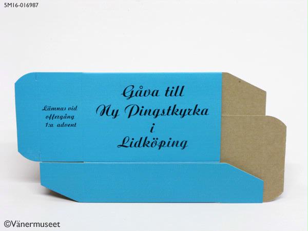 Sparbössa för offergångt den 1 Advent gjord för Pingstkyrkan i Lidköping. Svart text på blå botten. "Gåva till ny Pingstkyrka i Lidköping".