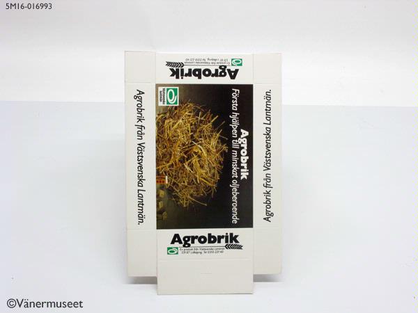 Förpackning för Agrobrik "första hjälpen till minskat oljeberoende", för Västsvenska lantmän i Lidköping. Färgbild på halm samt text i svart med logo i grönt.