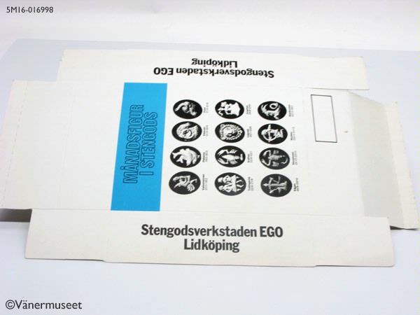 Förpackning för för väggplatta (?) "Månadsfigur i stengods", för EGO stengodsverkstad i Lidköping. Tryck i svart och blått med bilder på de olika månadernas tecken (från Vatuman till Stenbock).