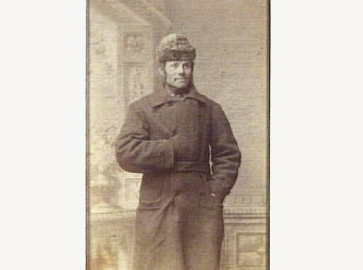 Han är iklädd ytterrock och pälsmössa.