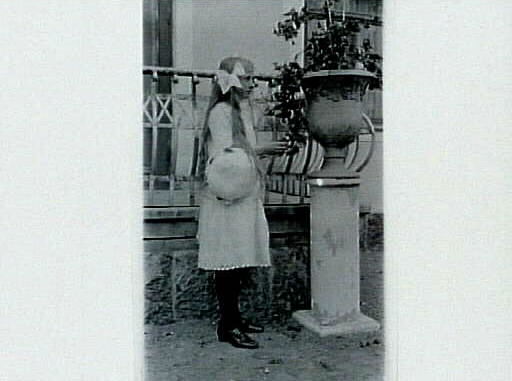 Ingrid Andersson vid nedre balkongen till Villa Lindsborg, Mellbygatan 20. Fotot är taget på sommaren och Ingrid är iklädd en vit spetsklänning och mörka strumpor samt skor. På armen bär hon en vit hatt med blommor på brättet.