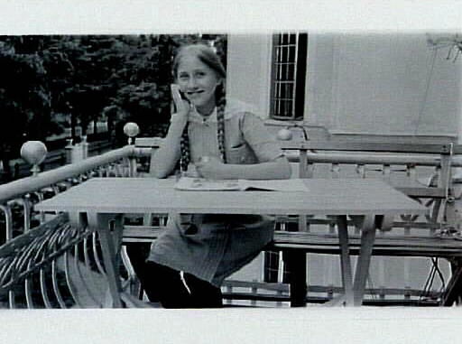 Porträtt av Ingrid Andersson, dotter till Albin och Mary Andersson, sittande på balkongen till Villa Lindsborg, Mellbygatan 20. 1915.