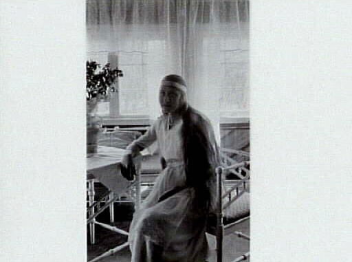Porträtt av Ingrid Andersson iklädd basardräkt i kaffevrån, dotter till Albin och Mary Andersson.