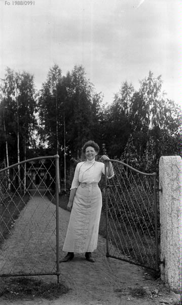 Augusta Wennerholm, Lidköping. Innehavarinna av syateljé och barngarderob vid Nya stadens torg 8. Hon var god vän till Mary Andersson. Augusta är avporträtterad vid grindarna till en villa. Hon är iklädd vit spetsblus och lång ljus kjol samt svarta kängor.