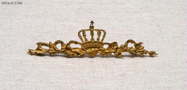 Förgyllt prydnadsföremål med en krona i mitten. Kan suttit på en liten spegel el. dyl. På baksidan är siffrorna 169 ingraverade.