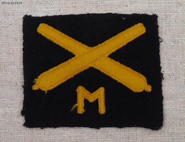 Uniformsmärke med två korslagda kanoner och ett "M". Gult på svart bakgrund. Märket står för kantornsbetjäning för medelstort artelleri. Låg i ett kuvert adresserat till menig Benjamin Lidholm.