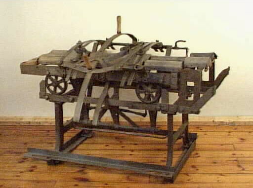 Handavskärningsbord för två-kupigt taktegel. På en stomme av järn rullar två par järnhjul, ungefär 15 cm framåt och bakåt. Denna rörelse förflyttar en därpå vilande järnvagn på vilken finns två pianotrådar spända på en järnställning med fjäder, en järnspets som vid förflyttningen rör sig i vertikal riktning och en pianotråd som skär till klackarna på teglets baksida. Vagnens sidorörelse erhålles med hjälp av ett rektangulärt trähandtag som sitter i lårhöjd och arbetaren har dettea handtag mellan benen. Vagnens fram-och återrörelse utförs med ett trähandtag ovanpå vagnen. På järnvagnen finns en glidränna bestående av tre par träkuddar täckta med mollskinn och monterade på en järnställning. Dessa glidkuddar är förbundna med vattenledningen och i ett hål på varje kudde dränks skinnet in med vatten, som glidmedel.