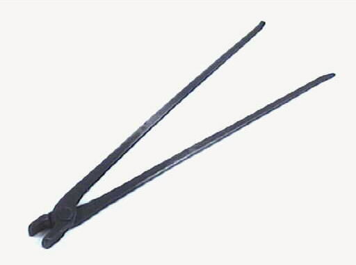 Smidestång. Långa skänklar i plant järn, avsmalnande mot änden och något uppåtböjda. Stort, plant ledfäste med stor ledskruv. Plana käftar, 26 mm djupa och 18 mm breda. Föremålet är täckt med sot. Tången användes för alla smidesarbeten med något mindre järnstycken.