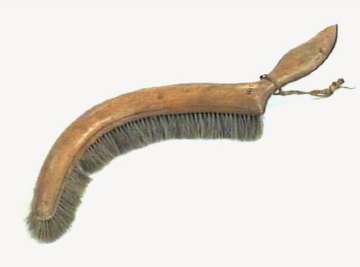 Klädborste. Halvmåneformad med inristad skåra runt den svagt kupiga överdelen i trä. Kort handtag i trä i bågens förlängning. Mörk borst med ljusare kant runt omkring. Borsten användes av skräddaren.