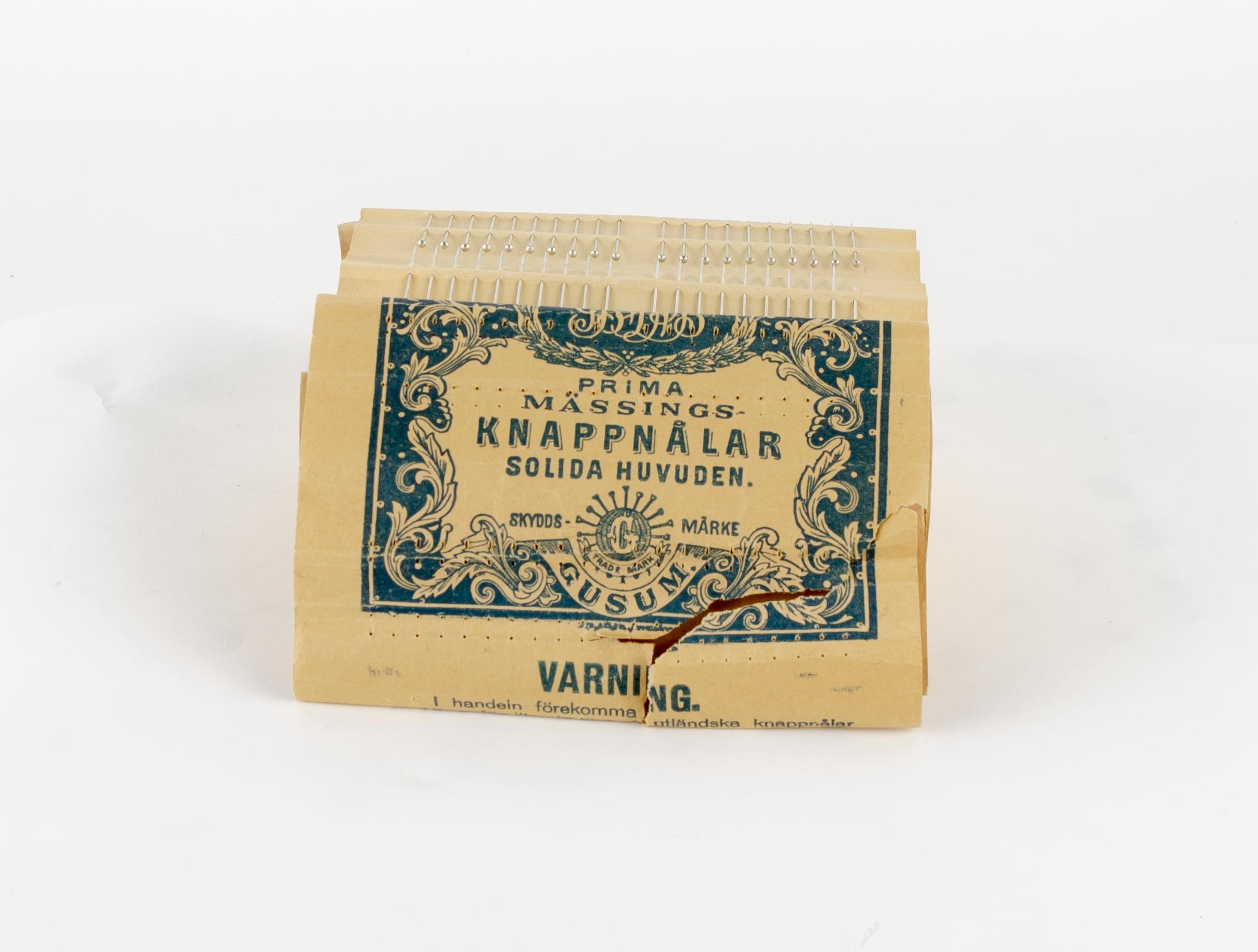 Karta med knappnålar, tio rader med knappnålar, två rader helt tomma, fyra delvis tomma. Knappålarna är moterade på en lång remsa oblekt papper. I mitten en etikett med blå växtranka och text: PRIMA MÄSSINGSKNAPPNÅLAR SOLIDA HUVUDEN SKYDDSMÄRKE TRADE MARK GUSUM.