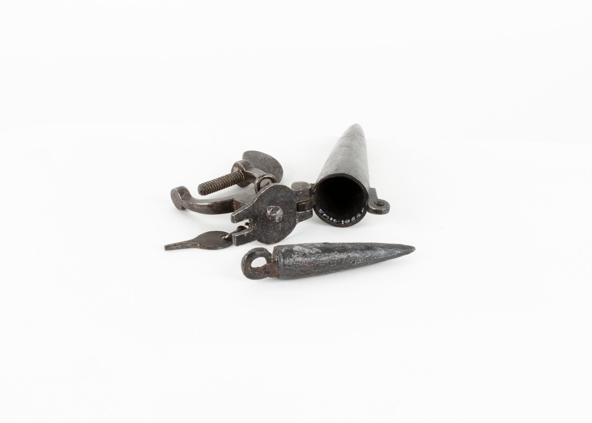 - Pipjärn. Strutformigt, ihåligt järn med lod och lock. Locket stängs med en järnplugg fäst vid järnställningen med en kedja. Järnställningen är U-formad upptill och har en mutter med halvcirkelformat huvud för att fästas vid en bordsskiva. På järnställningen är stämplat: "JFJ". Pipjärnet användes för strykning av krås eller kragar med veckning.