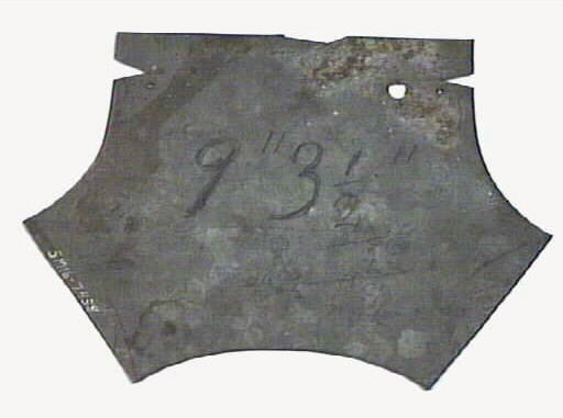 Plåtmall till stupränna. Modell till spänntratt eller "omkupa". Två plåtar från varje mall klipptes till, den ena kortare än den andra än den andra (markeringar och streck visar var den kortare klipptes). Måtten som står på är mått på rörstorleken eller rännstorlekar.