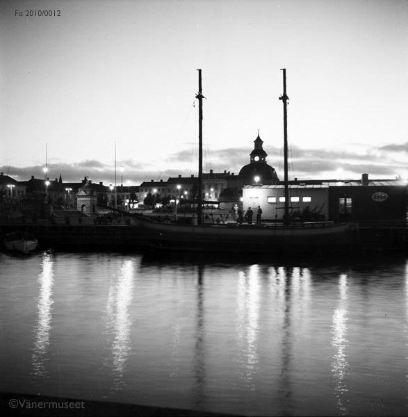 Vy över inre hamnen från Gamla staden mot Nya stadens torg och Rådhuset i Lidköping. Segelfartyg vid västra kajen.