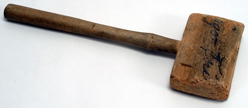 Träklubba använd av plåtslagare, med platt rektangulärt huvud som är 88 mm brett, 143 mm högt och 35 mm tjockt. Ett 300 mm långt skaft är fäst i huvudets ena smala långsida. Ur både skaft och huvud är flisor borta. På huvudet finns skrivet med svart färg. "Egon Fries" vilken var anställd hos Br. Sjöholm. Används vid falsning av plåt för att slå upp plåtkanten mot ett mothåll tex ett knoster (5M16-