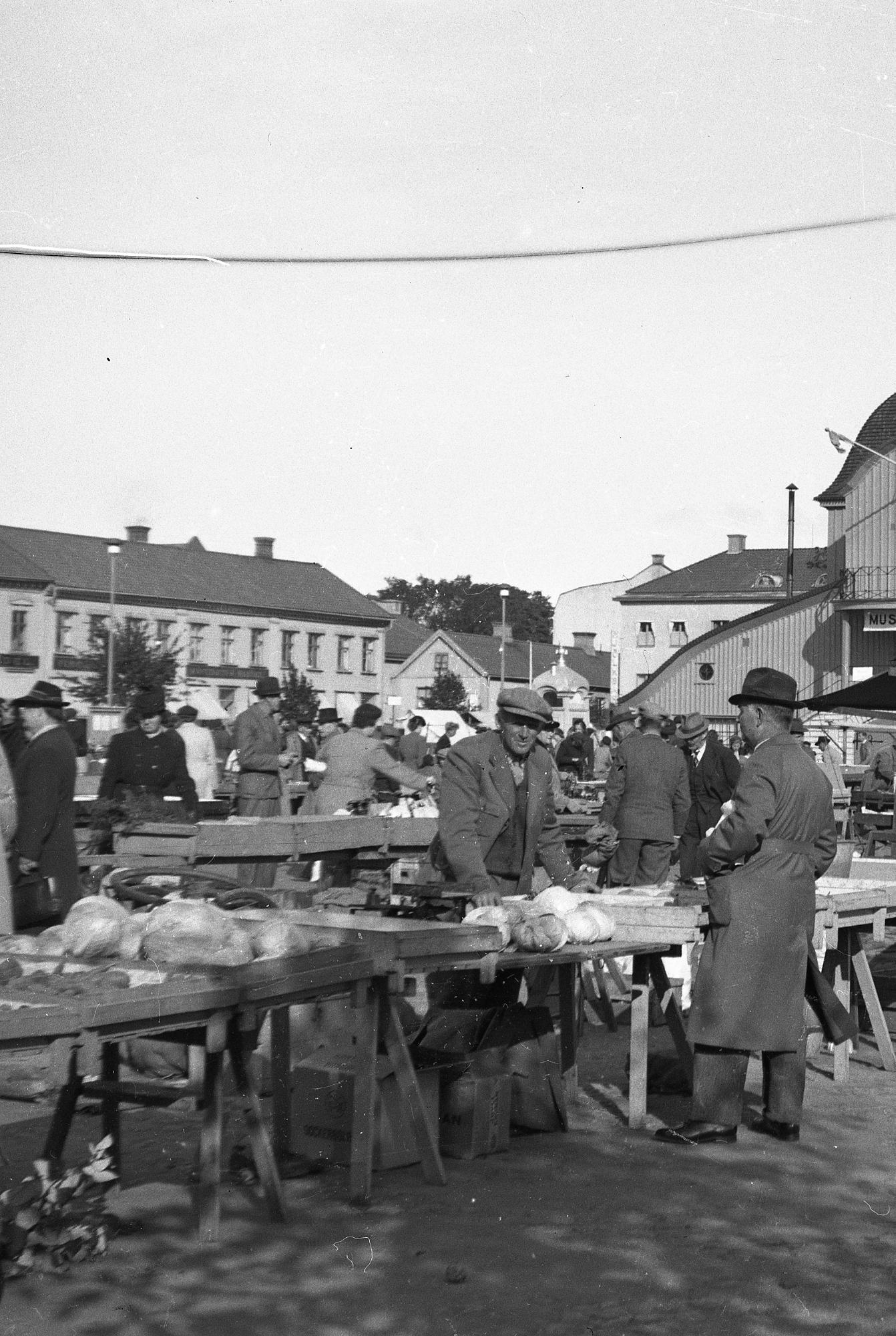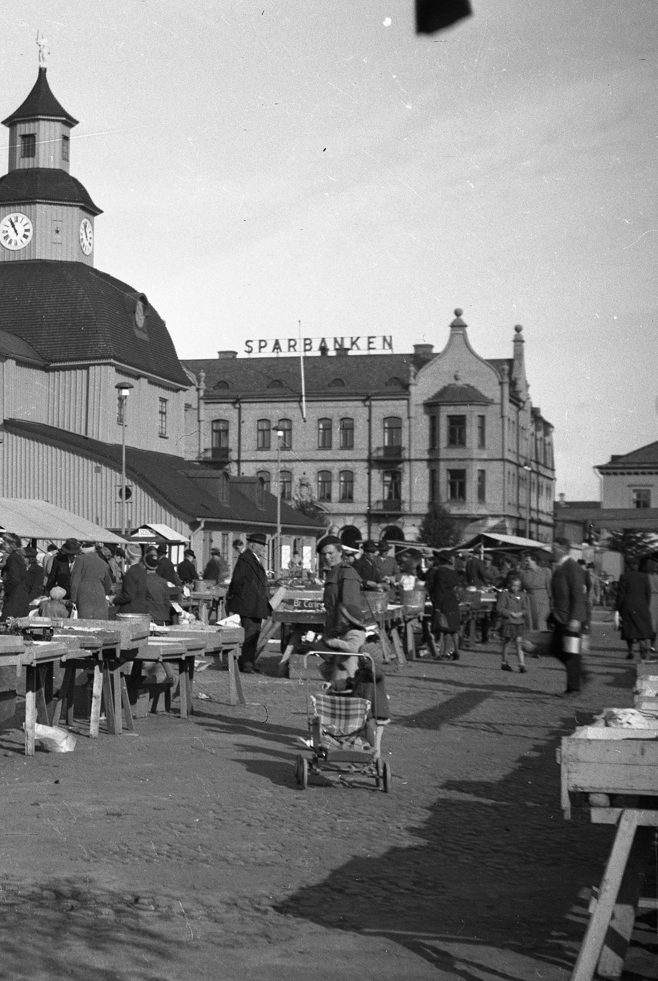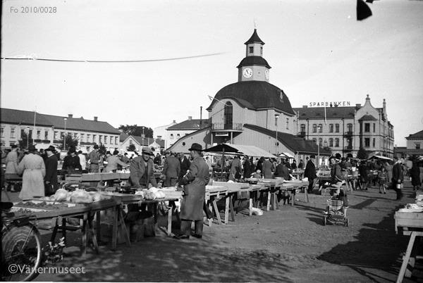 Vy från söder. Torgdag på Nya atadens torg i Lidköping. I bildens mitt Rådhuset, där bakom Sparbankshuset i kvarteret Bellona.