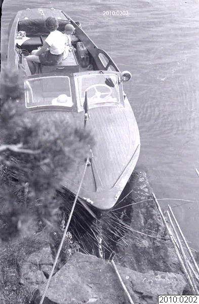 Fotografiet är från 1950-talet. Margareta och sonen Claes Tenggren sittande i racerbåten som GöstaTenggren byggt.