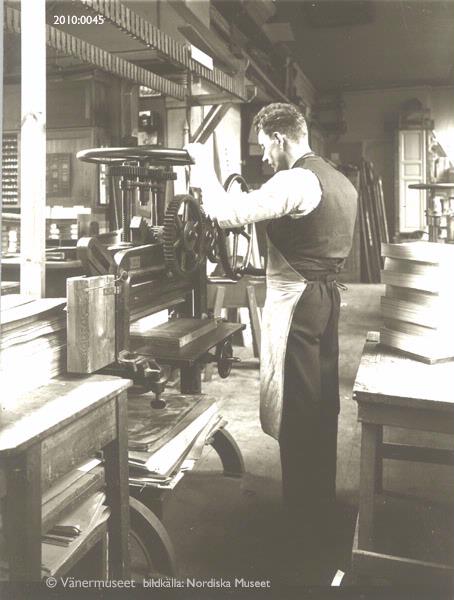 Bokbinderi-interiör. Man vid bokpress.