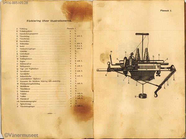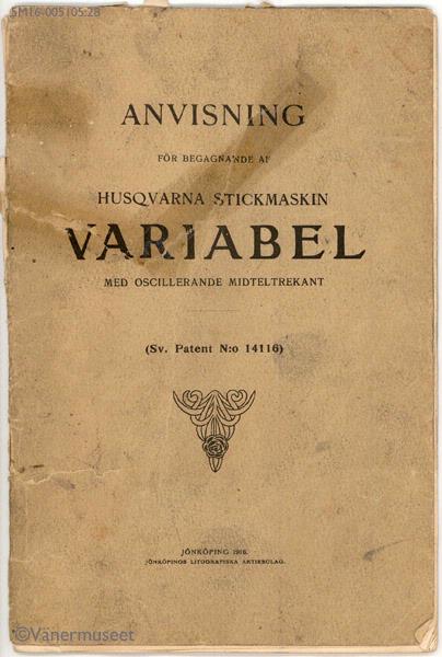 28. ANVISNING FÖR BEGAGNANDE AV HUSQVARNA STICKMASKIN VARIABEL MED OSCILLERANDE MIDTELTREKANT.(Sv patent N:o 14116). 32 sidor. Tryckt i Jönköpinmg 1918 av Jönköpings Litografiska Aktiebolag.