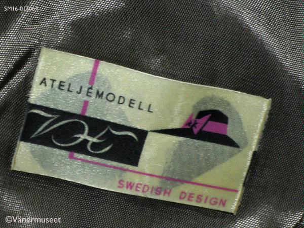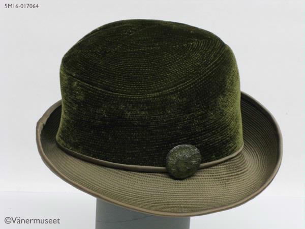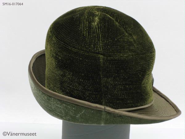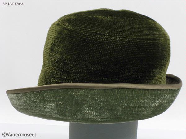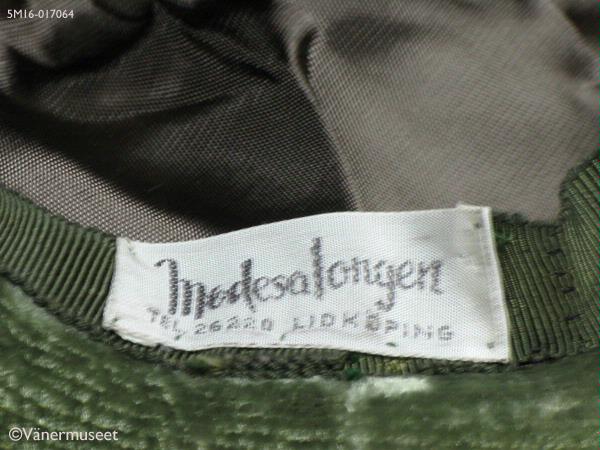 - Damhatt i grön sammet med 75 m brett brätte, smalare baktill i nacken. Brättet är uppvikt på vänster sida och sytt i ett slätt tyg med lugg på undersidan i en ljusare nans än kullen. Hela harren är sydd med täta, paralälla dekorsömmar, Slätt sidanband mellan kulle och brätte. På bandet en stor dekorknapp i grönt på höger sida. Fodrad med brunt konstsiden inuti. Grönt ripsband på insidan (svettband). På bandet sitter en lapp med texten: Modesalongen, LIDKÖPING. Inuti kullen en etikett med texten: ATELJÉMODELL VH, SWEDISH DESIGN. Hatten bärs av Margareta Tenggren daterat juli 1967, men förmodligen taget på våren.