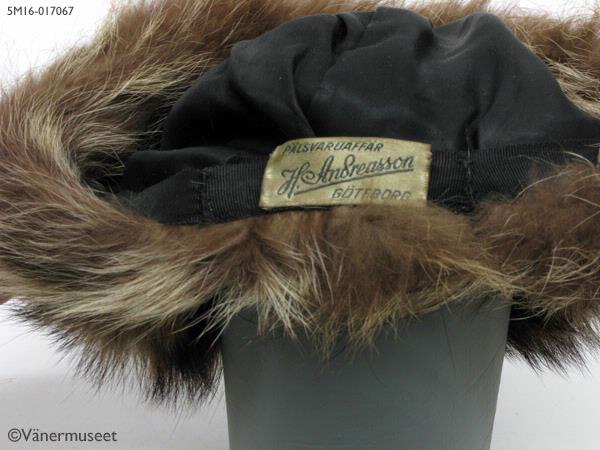Rund pälshatt i schubb (tvättbjörnsskinn), utan brätte. Fodrad med svart konstsiden. Svart ripsband på insidan (svettband). På bandet sitter en lapp med texten: Pälsvaruaffär H. Andersson, GÖTEBORG. Hatten bärs av Margareta Tenggen på fotografi från 1977.